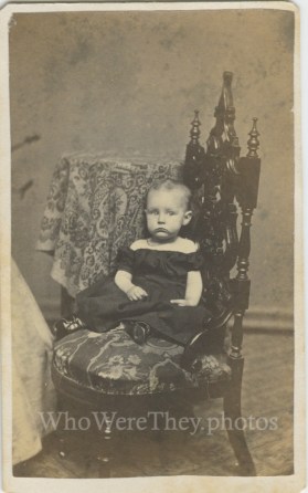 Look at this sweet little girl posed on such an ornate chair. I believe this to be a girl based on the wide neckline of her dress. You can just see her soft shoe clad feet at the edge of her skirts. She looks well wedged in against the chair and what looks like a cabinet or table behind her. The skirt of her mother or other female is visible on the left of the image. I’d venture to guess the child is between 1-2 years old. I’m tempted to date the image to the 1860s based on the apparent skirt width of the hovering parent, but the chair style and photo back mark seem a little bit later, perhaps 1870s.