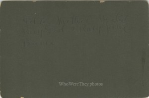 Today let’s look at this family. Their fashions look to be 1890s style dresses, although younger girl fashions are not my specialty. The photo is mounted sideways on a cabinet card. The back of the card identifies the family as follows: