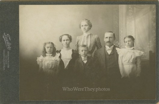I found the family and identified “Dad” as William Busse, born in Germany or Prussia in 1856 and emigrating that same year. In 1885, he married Allie Jenkins. They grew their family with Mabel in 1886, Ruby June in 1890, Dolly in 1892 and Raymond in 1895. Note how Mable in the middle (standing) looks a lot more than 4 years older than Ruby June who is standing on the far right. The young boy looks to be between 3-5 years old, limiting this photo timeframe to 1898-1900. Presuming the photo was made in the later 1890s, say 1898 or 99, Ruby June would have been 8 and Mable 12. Mable does not look 12 years old to me! It is also possible this photo is from a couple years later after the turn of the century, and the photographer was using old stock cards.