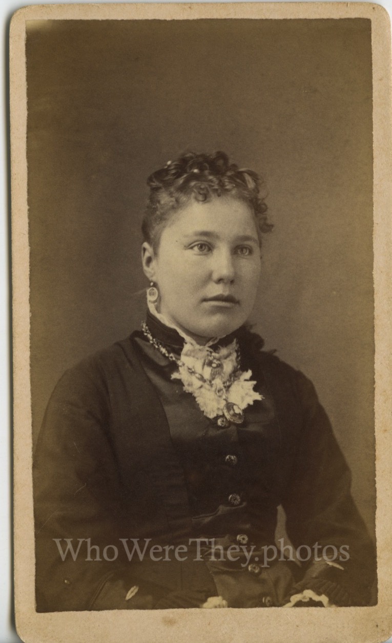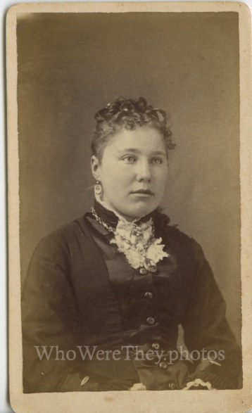 Today’s image is of a lovely, round faced lady with very curly hair. She has a jabot on her false vested dress, and a necklace over the jabot. The photographer was Harrington, who I have posted on an older post. A site reader at that time identified him as Neil P. Harrington of West Salem, Orrville and Wooster, Ohio.