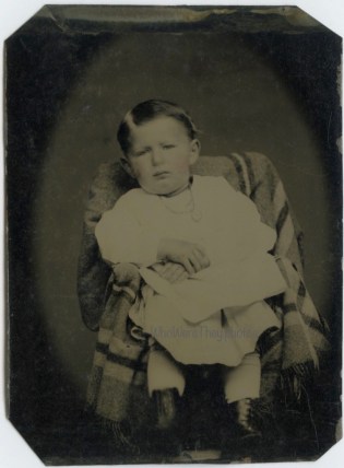Today’s image is a young child, perhaps under 2 years old. I think this is a boy based on the side part in the hair. The child is sitting in a chair draped with a striped blanket. Baby also wears a necklace with a locket. This tintype is in very good condition and the image is quite clear. The corners of the tintype were snipped off to make it easier to insert into a photo album. This was common with CDVs produced in the 1860s. During the 1870s, rounded corners were introduced on CDVs. I would imagine that with tintypes, this modification could have been made at home. Sometimes the tintype was encased in a paper sleeve but not always. There is an oval shadow around the child’s image, but I can’t tell if it is due to the photograph being in a frame or album, or if the vignette shape is part of the original photo.