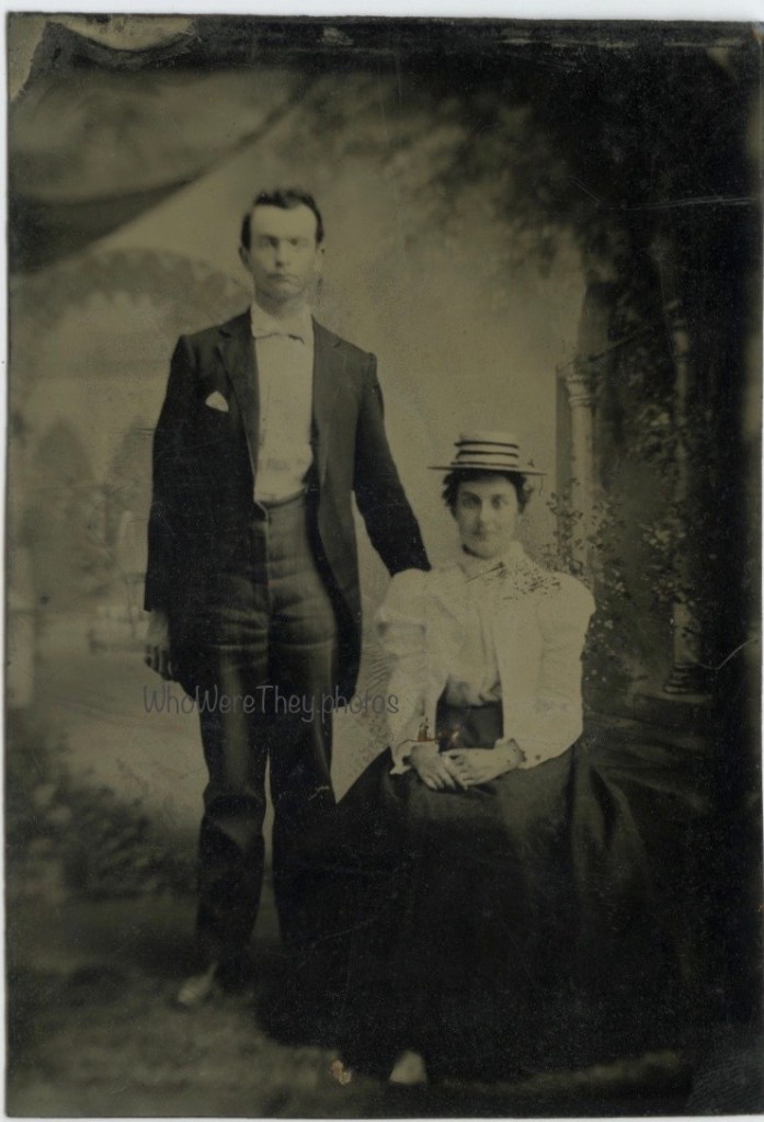 in its simplicity. It could be a wedding photo although neither is wearing flowers, which was a common way to show a photo was a wedding picture. The couple is carefully dressed, although notice the wrinkles in the mans slacks from sitting.