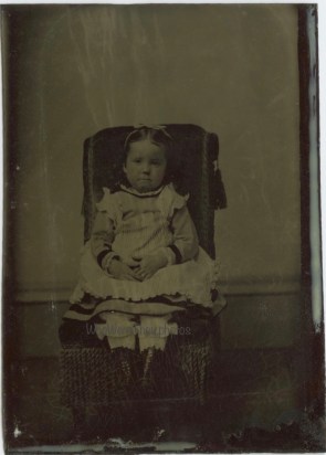 Today’s photo is an example of a little girl, dressed in her pretty pinafore dress. Pinafores were very common for young children – both boys and girls. They helped to protect clothing from messy play and potentially messy chores, such as inky schoolwork or helping in the barn. Pinafores could more easily be laundered, thereby preserving the dresses underneath for longer period of wear. This sweet, round faced child sits carefully in the chair. Her feet just barely hang off the edge of the seat. It is unfortunate the image isn’t more clear as I’d like to see her face and clothing a bit more clearly.