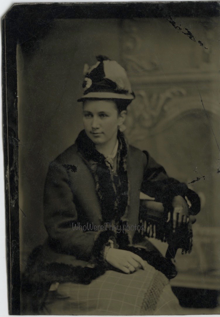 Tall hats were a popular millinery item during the bustle eras, helping to offset the wide backside with height. We can surmise based on this particular tall, feathered hat, that our subject was wearing a bustle dress. She’s also sitting sideways on the studio chair, although that wasn’t necessary when wearing a bustle dress. The details on this tintype are interesting.