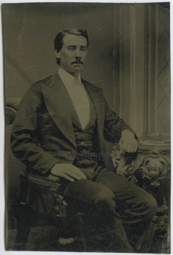 Since a fine gentleman, Mr So And So. From top to bottom we can see he is nicely put together. Note his tidy and lightly oiled hair, neat mustache, and serious but still somehow open expression. He has very wide lapels on his coat, reminiscent of a tuxedo when paired with the turned down and curved lapels of his waistcoat. His bowtie seems small and monochrome on the white shirt. Although we cannot see his shoes, I would imagine they were clean and polished. He looks altogether put together well, wouldn’t you say?