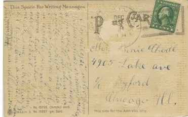 The card was possibly mailed in 1914, but there is damage to the area where the postal cancellation was made. It was sent to Anna Chodl, and the message is written in another language – possibly Czech according to site visitor Robin. If you can read Czech, please let us know what the card says! It was printed in Germany by Dessin. I find it interesting that the printed text is all in English, rather than in German.