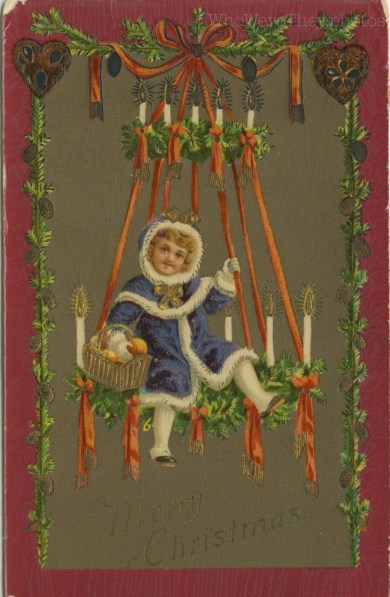 That does not look like a safe place for a child to sit! Today’s lovely Christmas card features a child in blue sitting on a lighted chandelier with ribbons and balsam. Call me a helicopter parent, but that just seems like a very bad combination of things lol.