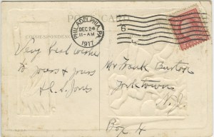 The card was mailed in 1917 from Al S Jones in Philadelphia, PA to Mr Frank Barton of Yorktown, NJ and the greeting reads