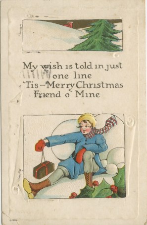 This sweet, embossed card features a young person sitting in the snow, holding out a gift. It reads