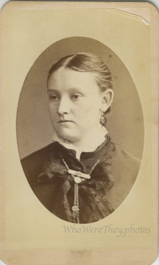 This photo made by Charles A Saylor casts the subject as looking contemplative. What do you think she was considering? I love her jewelry – earrings, a necklace of multiple chains and a bar pin. She has some kind of frill, like a large bow, on her dress under the necklace & bar pin. She was young, perhaps early twenties when this photo was taken, based on the softness in her face.