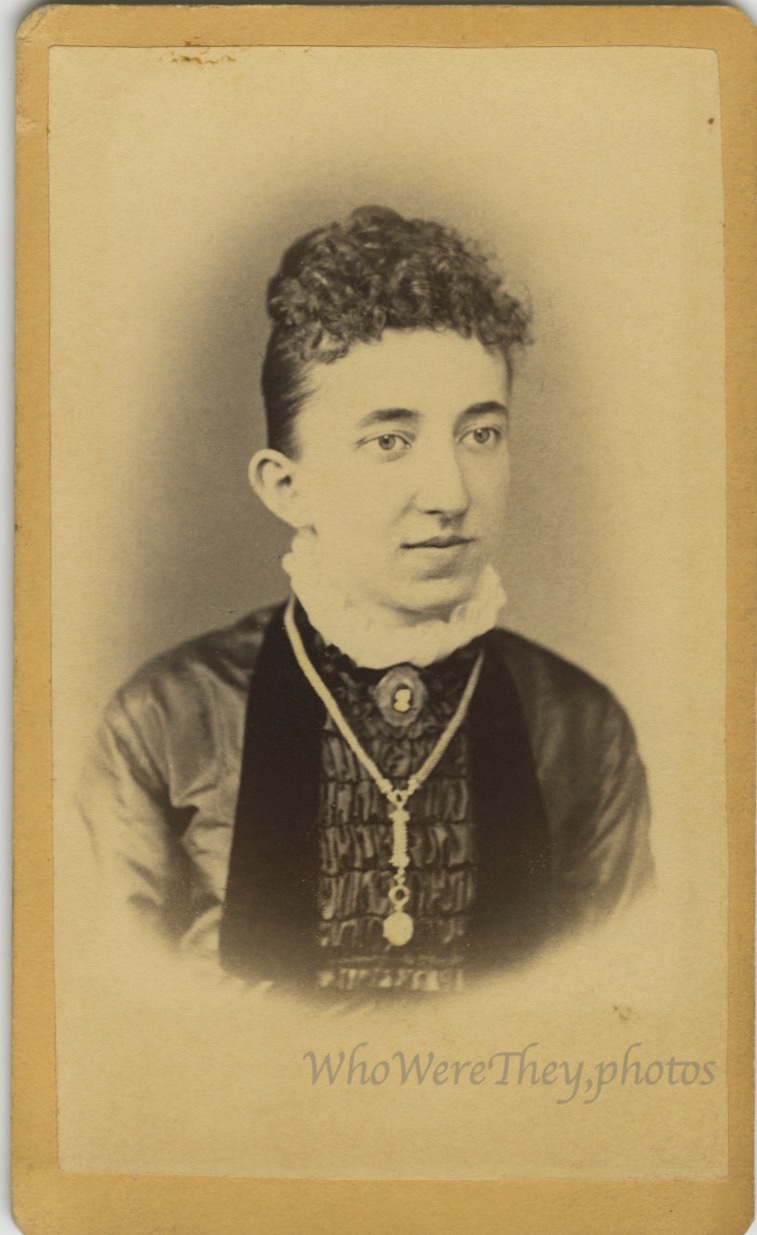 Today’s attractive young lady is showing off an interesting necklace. I have seen similar shaped necklaces on other cabinet cards and CDVs, so I assume this was a fashion trend in the 1880s. Note her brooch – a cameo? – above the necklace, and above that the ruffled collar. It feels a tiny bit Elizabethan, to be honest.