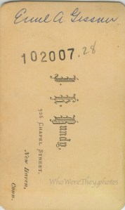 Let’s see if today’s name deciphering game is correct. The back of this CDV identifies the gentleman as Emil A. Gessner. I did find a matching person in New Haven, CT where this portrait was made. Assuming it is the same person, this is Emil A Gessner, born 1856 in Germany. Emil and his wife Martha (1857) had 6 children: Elizabeth (1878), Mabel (1881), Steven (1883), Everett (1885), Martha (1886), and Francis (1891). The census revealed that Emil was a druggist at the Apothecaries Hall in New Haven, and owned his home. The following drawing accompanies his Find A Grave page, suggesting he was in the military of some kind. He lived in New Haven his entire life until his death on February 3, 1930.