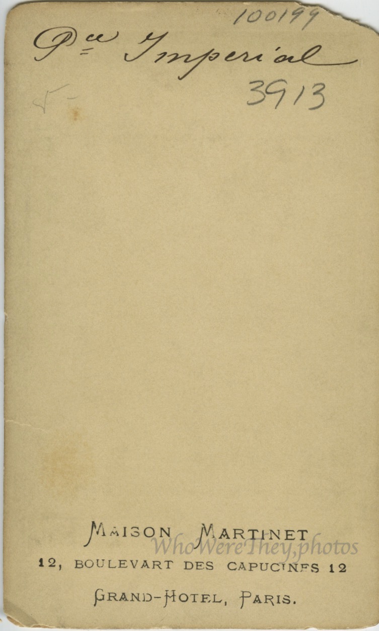 I found that this particular image is the portrait of Eugenio Luis Juan Jose Napoleon IV Bonaparte (1856-1879). The reverse of the card indicates “Prince Imperial” which was his official title. Known as Louis-Napoleon, he was the only child of Napoleon III, Emperor of France and Empress Eugenie. The prince relocated with his family from France to England when his father was dethroned in 1870. He was only 14 at the time and eager to make his own name. As such, he served in the British Army during the Anglo-Zulu war in 1879, in which he was killed at the age of 23 in a rather rash and unwise venture into enemy territory without a full contingent of soldiers. His death ended the hopes of Imperialists who wished to return him to France and claim the throne as a 4th Bonaparte emperor. These prints were likely sold as souvenirs by the bookseller Maison Martinet.