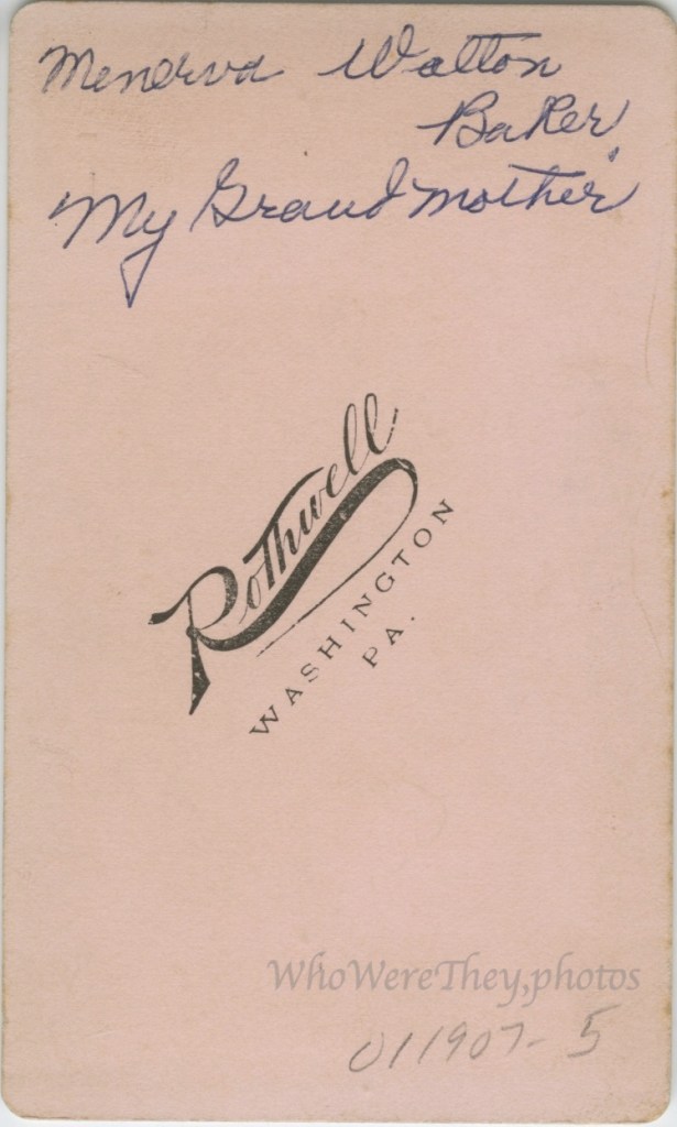 This is a wonderful image of Minerva Walton Baker. You would think with a great name like Minerva it would not be too difficult to find her in genealogy websites, but the fact is, in Pennsylvania, there were both Minerva Bakers and Minerva Waltons. I can find several female children named Minerva Baker, and several married women named Minerva Walton, but not a married woman named Minerva Walton Baker. I had hoped to find the descendants to return the photo, but it is now upon them to find this site.