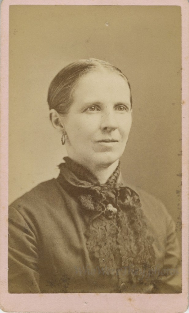 UPDATE – thanks to site readers mouselyk and Tabitha we found out this is Minerva Walton Baker, 1836-1894. See her Find-a-grave page here. She was married to Daniel Baker in 1857. Based on the Finda-a-grave page, she had three children: James, Lydia (Bigler) and Ola (Ross). According to Ancestry dot com, she had 8 children, some of whom did not survive childhood or early adulthood.