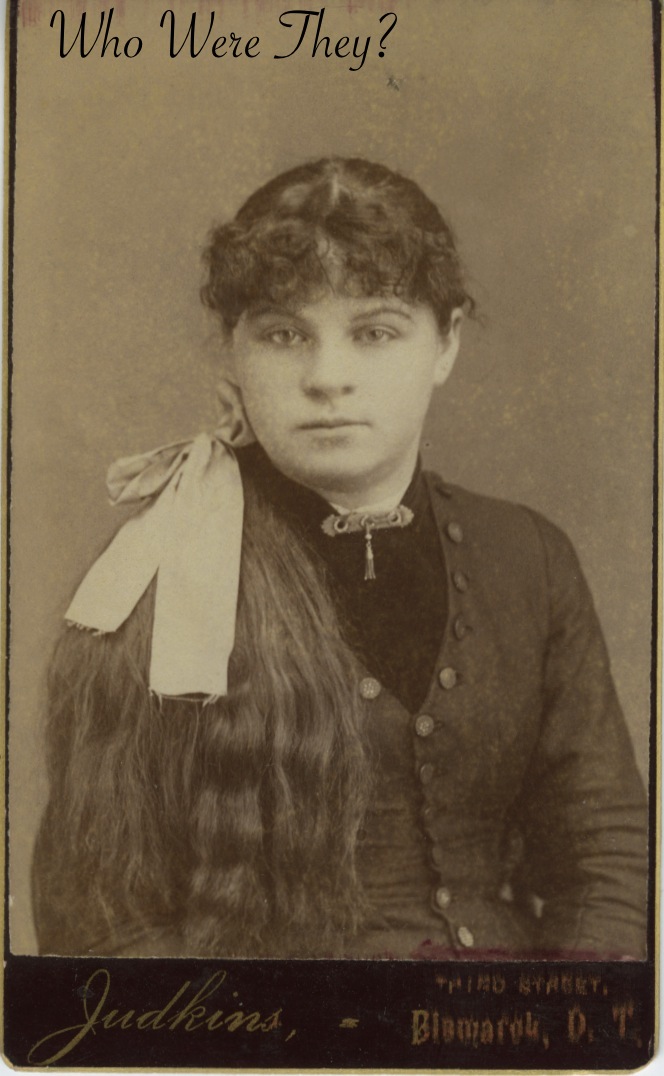 The photographer was Judkins in Bismark, Dakota Territory. As we learned recently, Dakota Territory existed for a short period of time, so the photograph can be dated between 1861-1889. We can further narrow the time frame to between the mid-1880s to 1889 based on the use of a dark card. These dark colors were introduced in the mid ’80s, and while they were used through to the mid ’90s, Dakota Territory became South and North Dakota in 1889.